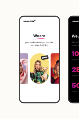 Okamedia, la plateforme pour les influenceurs et monteurs vidéo. Allégez votre charge de travail et concentrez-vous sur la production de contenus de qualité. Nous avons produit une identité punchy et dynamique à l’image de la cible.